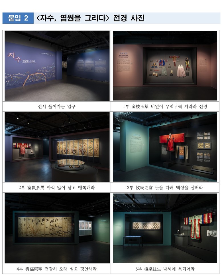 이번에 개편된 <자수, 염원을 그리다> 전시는 사람의 일생을 한 편의 꿈에 비유해, 탄생부터 성장, 혼인과 관직, 장수와 내세에 이르기까지 전 생애의 염원을 자수라는 매체로 촘촘하게 풀어내며, 자수가 장식을 넘어 ‘기원의 상징이자 기록’이었음을 쉽게 이해하도록 구성했다.