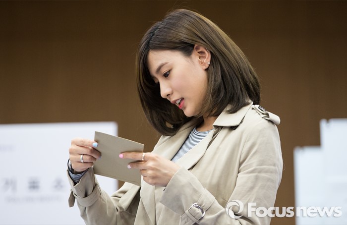 △ 투표용지 살펴보는 에이핑크 오하영 |